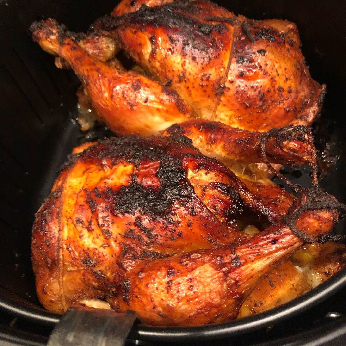 Place chickens into basket of air fryer and close lid. Set temp to 360 and timer to 40 minutes. Check that temperature reads 165 degrees in thickest part of thigh. Remove birds and let rest for about ten minutes or so before serving. Use the juices to drizzle over carved chicken!